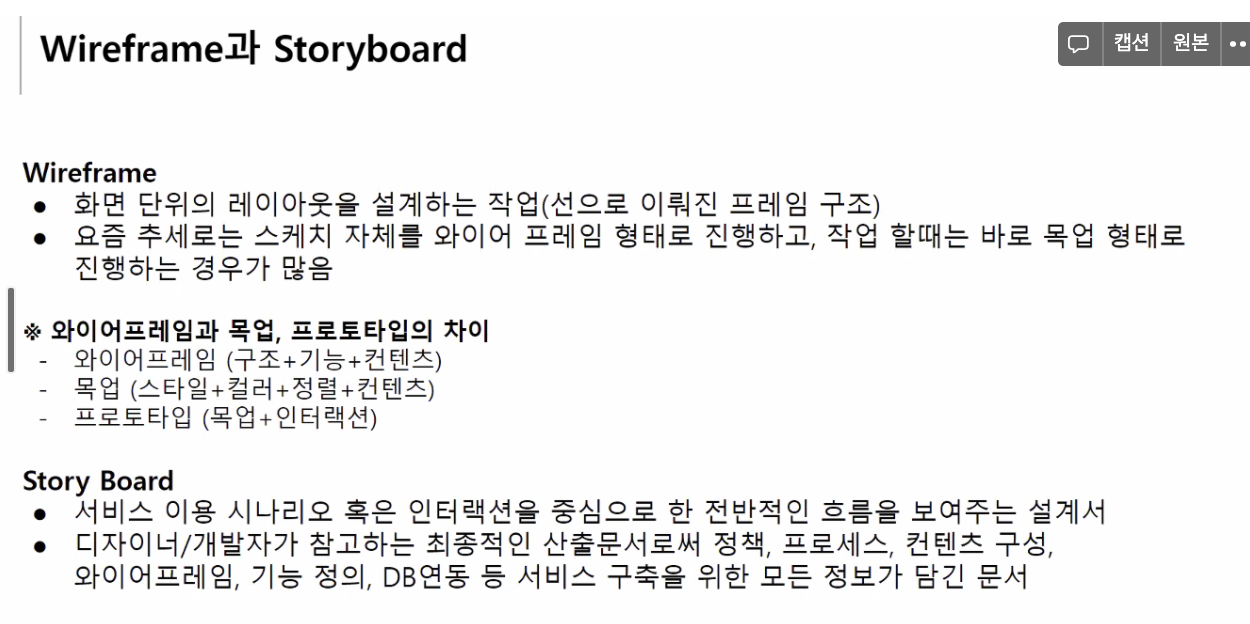 와이어프레임 : 선으로 이루어진 구조, 기능의 표시, 콘텐츠 (카드로 구성된 콘텐츠다, ~~등)